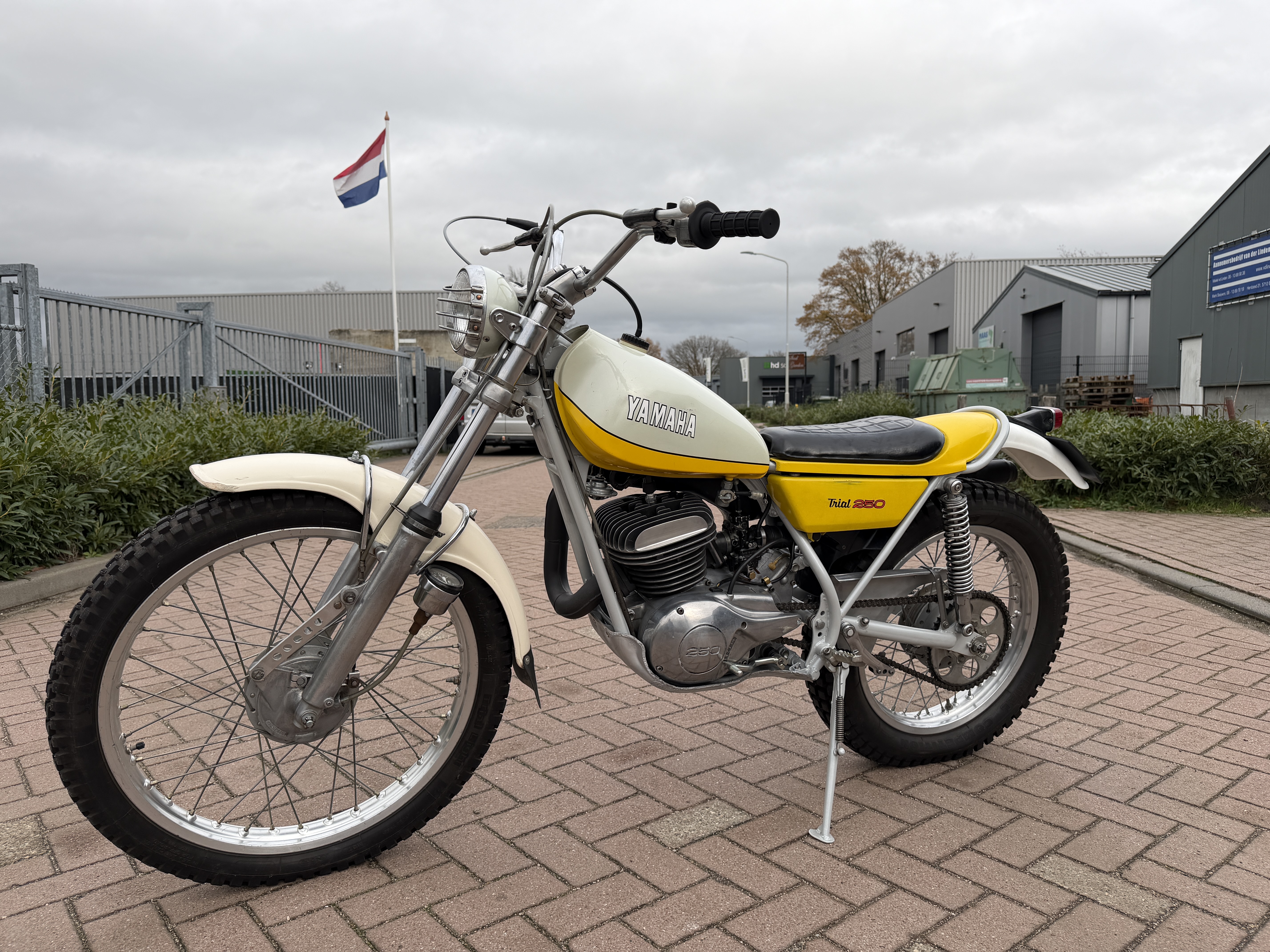 Diese Yamaha TY 250 ist vollständig authentisch, inklusive der ikonischen gelb-weißen Lackierung und Originalteilen.